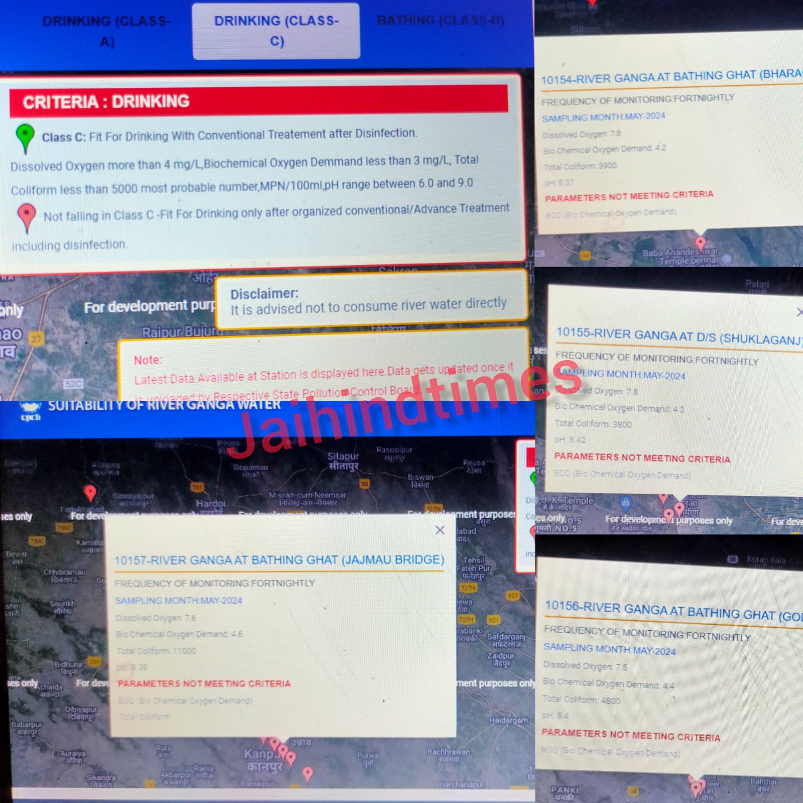कानपुर, कन्नौज, मिर्जापुर, सोनभद्र, वाराणसी, गाजीपुर और बलिया…ये वो शहर हैं, जहां गंगा का पानी इस्तेमाल करने लायक नहीं है। न तो पीने के लिहाज से सही है और न ही इससे नहाया जा सकता है। कानपुर में नानामऊ गंगा ब्रिज, भैरव घाट, डी एस शुक्ला गंज, गोला घाट, जाजमऊ ब्रिज, जाना गांव और पुराना राजापुर जैसे स्पॉट हैं। यहां पानी इंसानों के पीने और नहाने लायक नहीं है। इसी तरह वाराणसी में गोमती नदी में मिलने से पहले भुसावल और जमनिया गंगा ब्रिज का पानी न आचमन करने लायक है, न ही नहाने लायक।