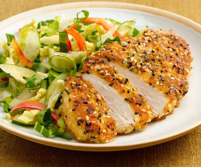 - फिर ऊपर से तिल डालकर कोट कर लें। इसके बाद चिकन को 220 डिग्री सेल्सियस पर 10 मिनट तक बेक कर लें। (ध्यान रहे, ऐसा करते समय बीच-बीच में तेल लगाते रहें)।
