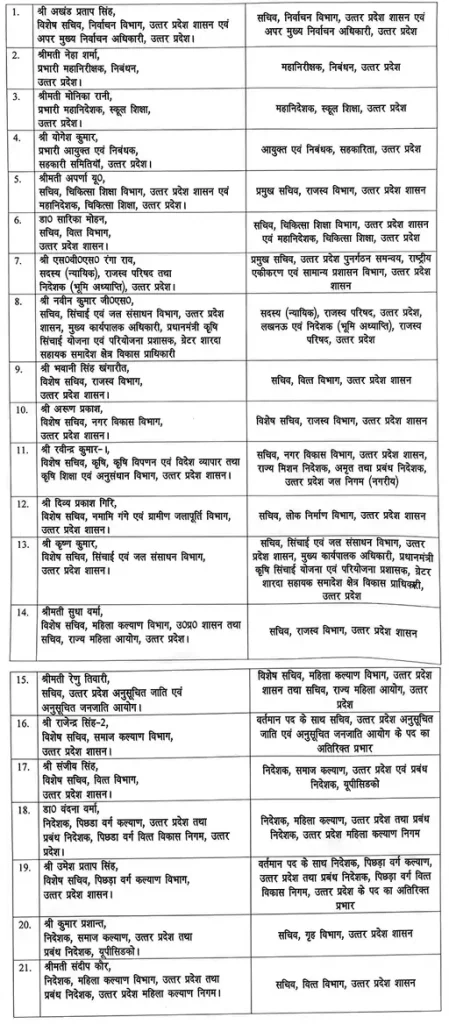 इसके अलावा, निर्वाचन, वित्त, राजस्व, नगर विकास, चिकित्सा शिक्षा और महिला कल्याण जैसे विभागों के अफसरों में भी फेरबदल किया गया है। अपर्णा यू को प्रमुख सचिव राजस्व, एसवीएस रंगाराव को प्रमुख सचिव उत्तर प्रदेश पुनर्गठन समन्वय राष्ट्रीय एकीकरण तथा सामान्य प्रशासन बनाया है। इसके अलावा अखंड प्रताप सिंह विशेष सचिव निर्वाचन से उसी विभाग में सचिव बनाए गए हैं। transfers 21 IAS officers