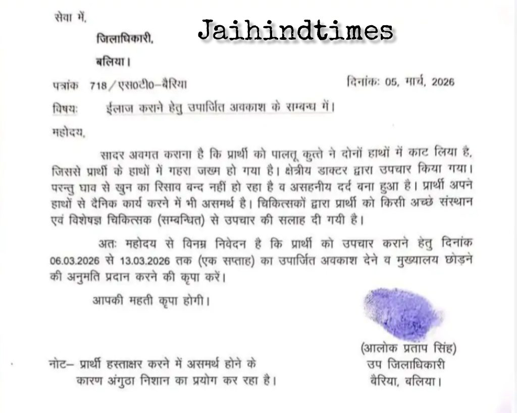Home Breaking News Uttar pradesh News : SDM ने कुत्ते के काटने पर मांगी 8 दिन की छुट्टी, एप्लीकेशन पर अंगूठा लगाया, Letter Viral